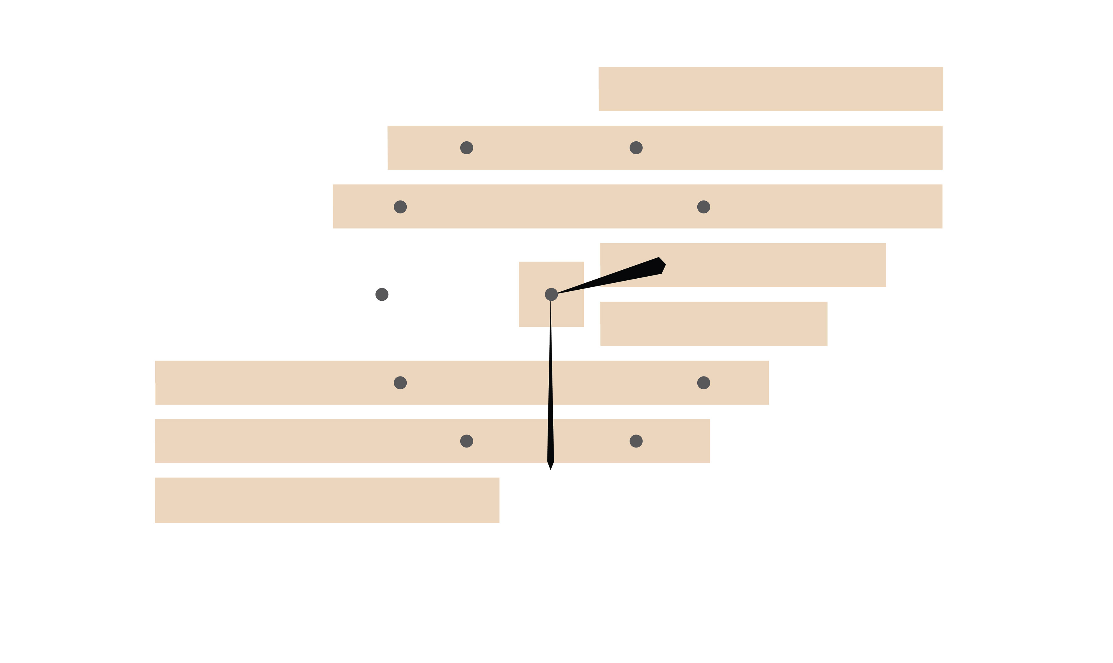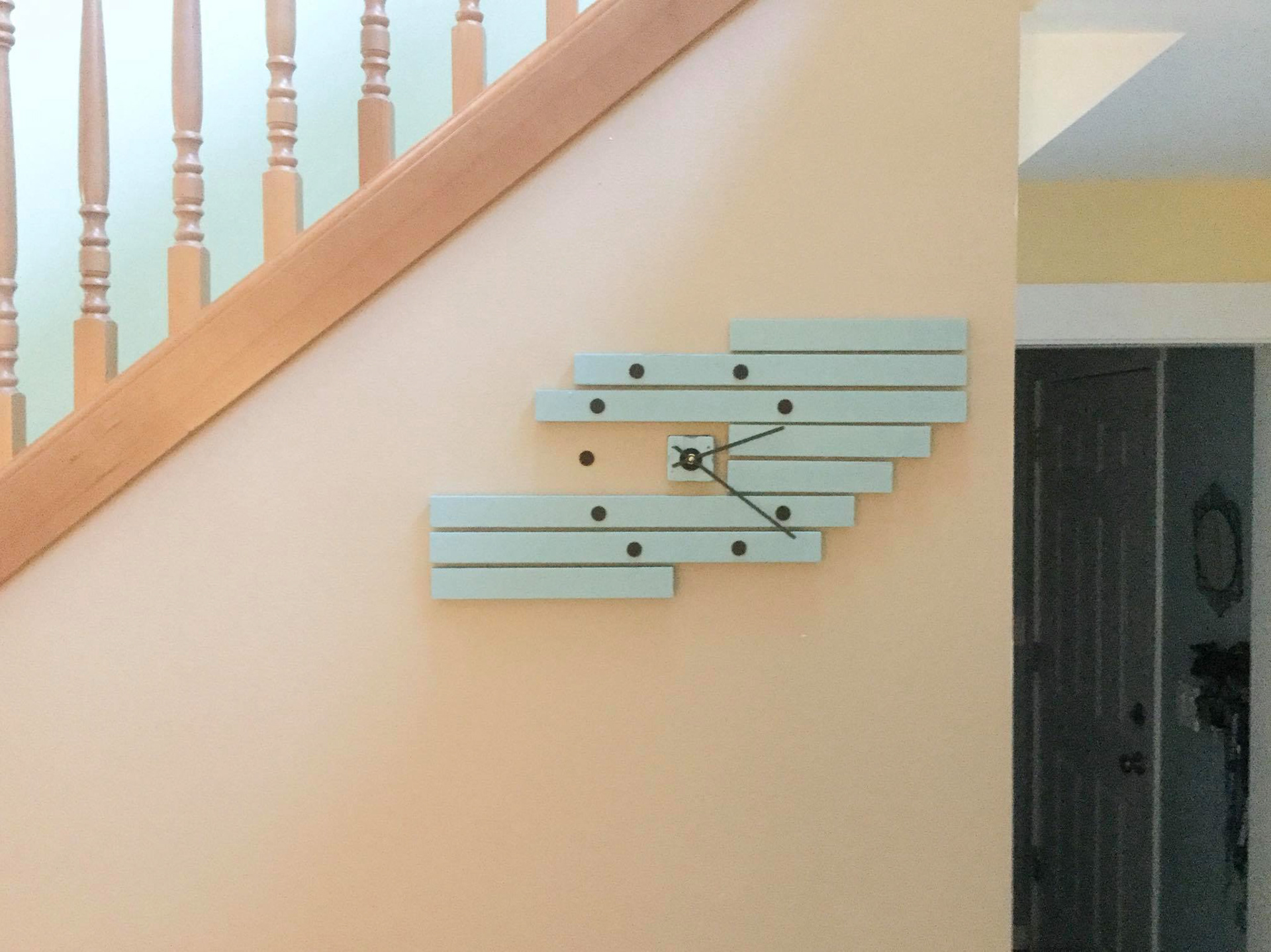 Clock designed for my sister. Made from a series of horizontal boards attached to the wall with Velcro. Painted with accents from the home. Round black dots are felt furniture cozies.